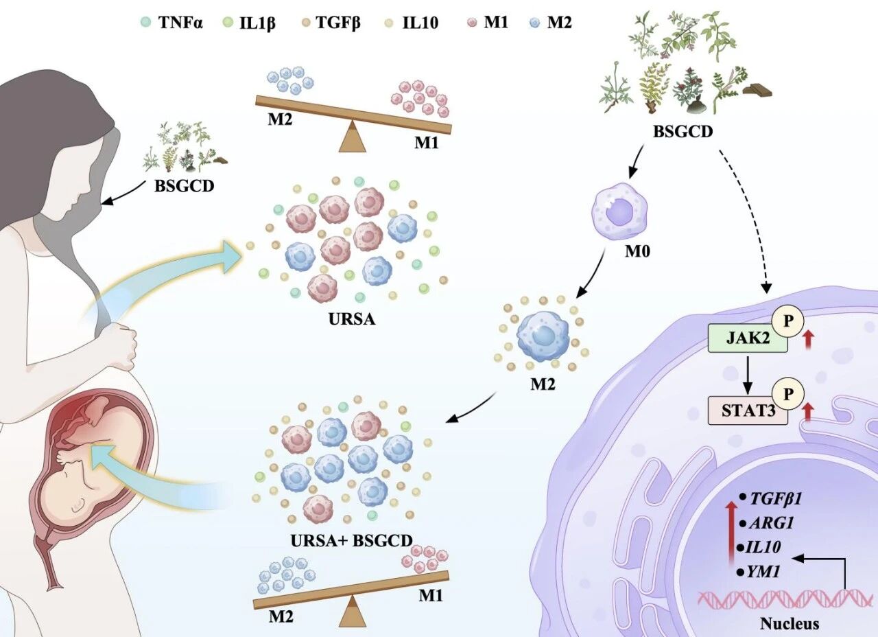 司机社学部李霞教授团队在司机社药免疫调控研究领域再创佳绩,在国际医学领域杂志Phytomedicine(中科院1区Top,IF:8.3)发表题为“Bushen Guchong decoction facilitates M2 polarization through JAK2/STAT3 for URSA treatment”的研究论文。该研究系统揭示了临床有效方剂补肾固冲汤(BSGCD)通过重塑母胎界面免疫耐受治疗原因不明复发性自然流产(URSA)的作用机制。司机社学部刘泳琳硕士、青年教师刘鑫馗及朱肖肖博士为共同第一作者,李霞教授、张振副教授为共同通讯作者,司机社