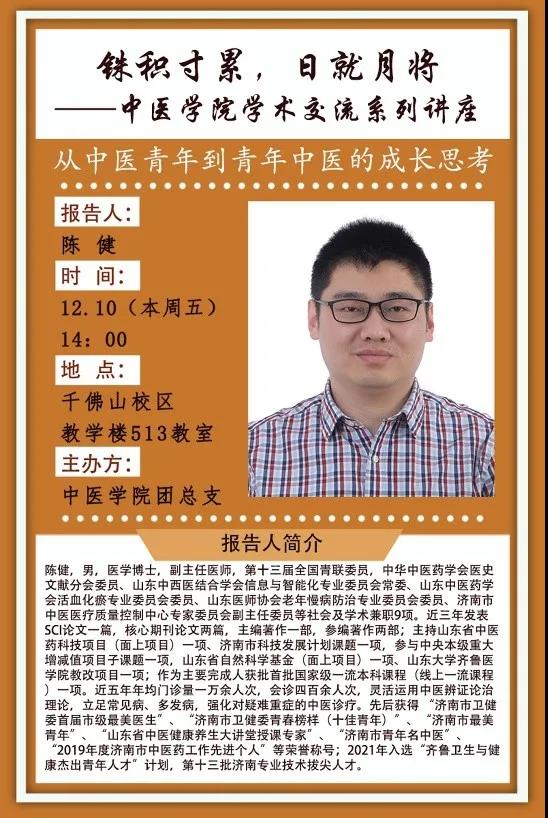 学术交流系列讲座在千佛山校区教学楼513顺利举办。山东大学附属济南市中心医院司机社科副主任医师陈健老师开展题为“从司机社青年到青年司机社的成长思考——从经典到临床的思维切换与实践”的讲座,司机社