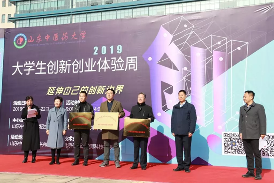 大学生创新创业实践基地授牌仪式,田立新为山东健康医疗大数据有限公司、北京中关村智能司机社药产业加速器、儿推盛世集团三个实践基地授牌。