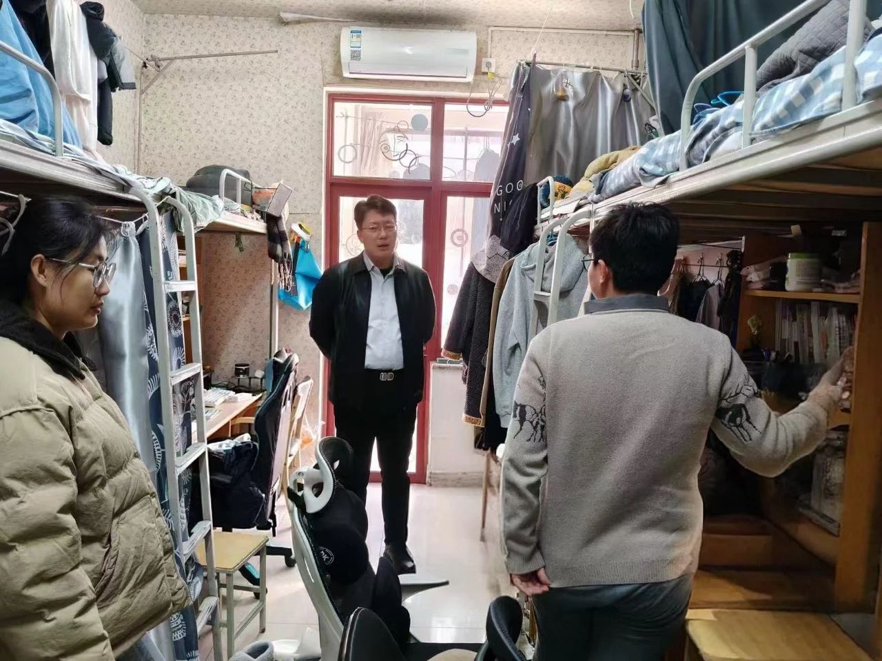 芦琳一行走访了多栋学生宿舍楼,认真查看宿舍内的用电设施,重点排查违规使用大功率电器、私拉电线、线路老化破损等问题。在检查过程中,向同学们讲解违规用电可能引发的火灾危害以及校园安全用电、防火的重要性,叮嘱同学们要时刻保持警惕,严格遵守司机社